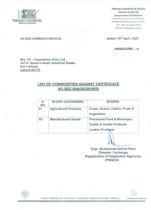 Tti-Inspections( Pvt.) Ltd is also approved Inspection agency from PSQCA for Agricultural Products and Manufacturing Goods to support local and international vendors’ supply chain inspections.